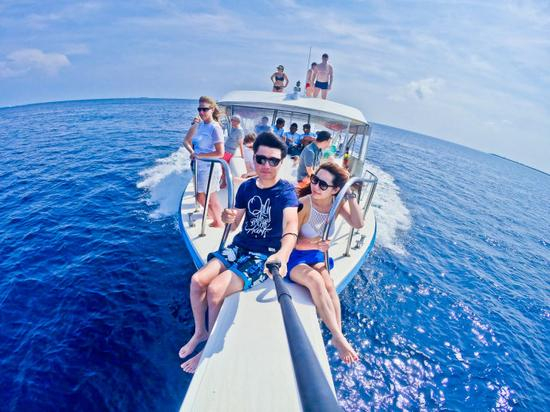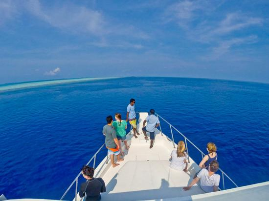 选择Vilamendhoo岛的人一般都是热爱大海的主,V岛口碑最好的出海活动叫OCEANDISCOVERY。有看鲸鲨,或者看海龟和魔鬼鱼,都是一周两次,但因为我到的是旺季,每次出海最多22人很容易达到,于是天天能够出。出海分全天和半天两种,半天坐的是快船,全天是多尼船并包午饭。半天55美金一个人,全天是105美金。