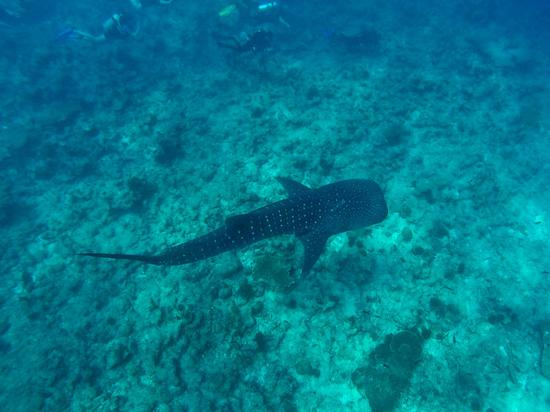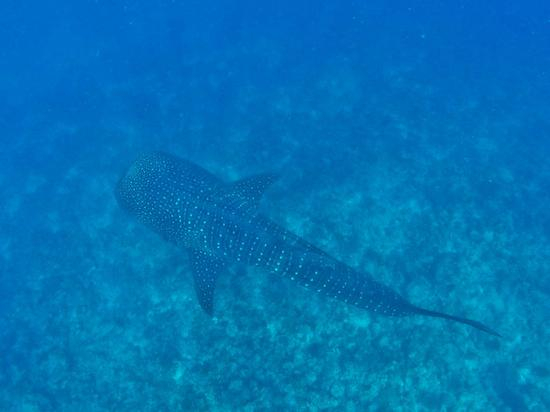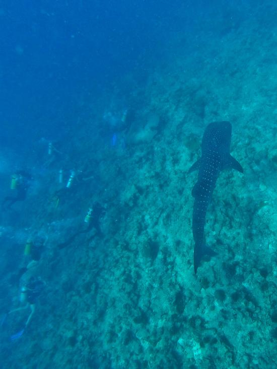 给个小tip,小黑让大家跳水的时候不要那么着急的跳,因为船总是会停在鲸鲨即将游到的地方,冲着人群过来的方向跳下去,等一会,就能看到鲸鲨冲着你游过来了,节省了追它的体力,还能伴着它游很长的时间。追不上了,就上船,小黑会开船接着帮你追。我就是因为动作慢,好几次大家跳下去扑空,游的半死上来看到我在悠闲的穿脚蹼喝饮料~