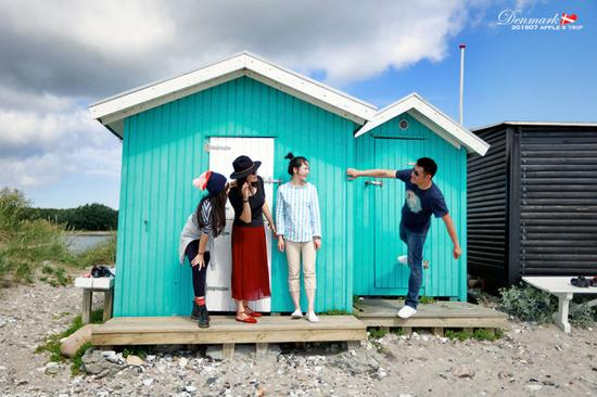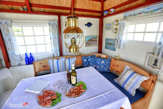 海边最标志性和有特色的是一排整齐的尖顶小房子度假屋子,我们有幸来到一个装饰很特别的丹麦风格的红房子里休息