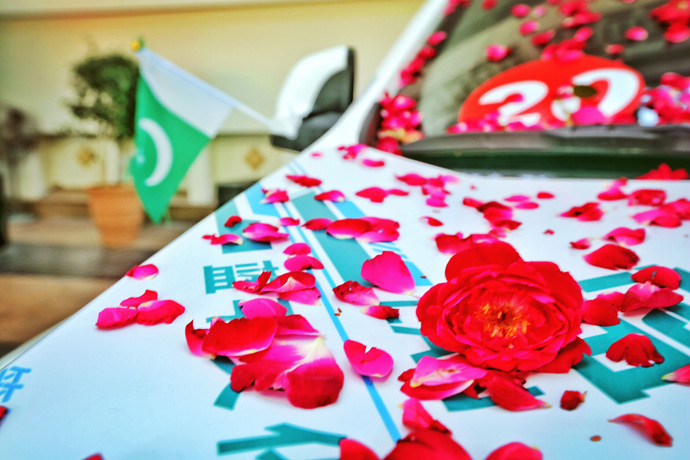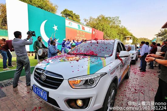 而从伊斯兰堡到“花园城市”拉合尔之后,车队就真的走上了花路。每条街都是欢迎车队的道旗,驾车在这样的花路之上,每一位队友都激动万分,这样的欢迎方式独具特色,满溢的花香就像几十年来中巴的有意那样绵长。“巴中友谊万岁”就是这些天巴基斯坦人民的口头语,短短的几个字,道不尽的情意绵长。有时候我们常常会觉得语言的表达太表面,但是在巴基斯坦,每一句“友谊万岁”都能体会到浓浓的情谊。
