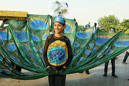 孩子们装扮成孔雀来迎接我们。
