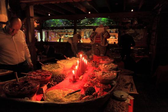 餐厅已经开门迎客,海盗船上摆满了美味佳肴。