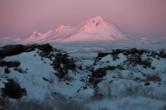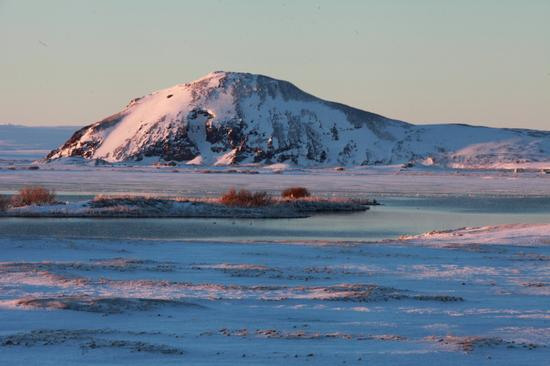 火山下的米瓦登湖,未结冰的湖水在荡漾。