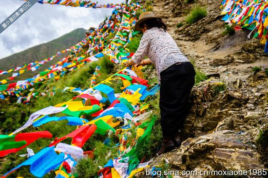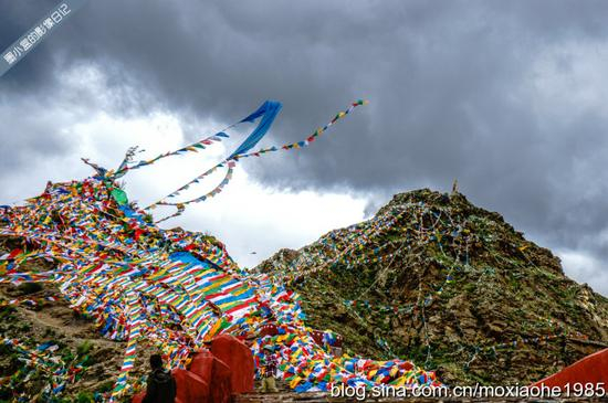 后山上,经幡已经布满山头,依旧还有更多虔诚的人们前来拴经幡,祈福,我在他们的脸上看到的是平和,是微笑,是幸福,有一种感受,是无法用语言形容得出的,就算你觉得已经用尽了毕生所学得的词汇,也无法让看到他的人感同身受,就比如我坐在这山头上收获到的感动,远非一张照片可以传达。