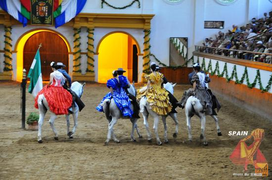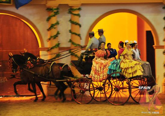 据说这是典型的西班牙乡土式马术。马车后面依旧带着美女。