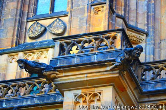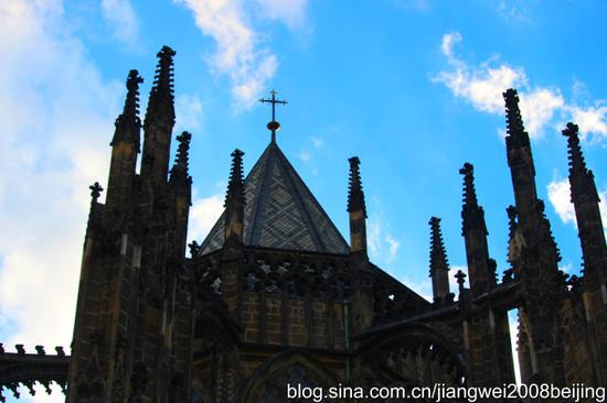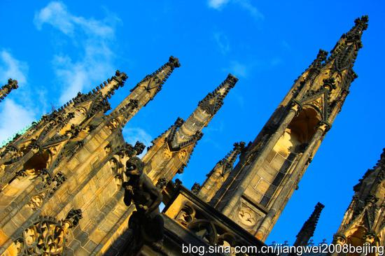 圣维塔大教堂(Katedrala sv。 Vita)位于维而塔瓦河西岸的布拉格城堡内,是布拉格城堡最重要的地标之一,建筑将近700年,圣维塔大教堂是布拉格城堡最有“建筑之宝”的美誉,除了丰富的建筑特色外,也是布拉格城堡王室加冕与辞世后长眠之所。从大教堂高耸入云的尖塔、内部屋顶交错的横梁和外面的飞拱 (flying buttress) 结构,不难辨认它属于典型的哥德式建筑,大门上的拱柱等装饰都很华丽。布拉格王室的加冤仪式在此举行,以往王室的遗体也安葬于此,这里还保存着国王的王冠和加冕用的权杖等。