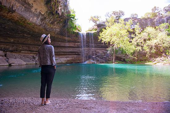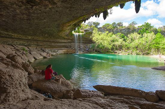 汉密尔顿池位于德克萨斯州奥斯汀市(Austin)以西约37公里处,隐藏在自然保护区内(Hamilton Pool Preserve)。从市区出发,不到一小时就可抵达。保护区地处偏僻,蜿蜒山路上一个毫不起眼的小分叉路尽头便是。如果自驾前往,建议提前查好行程或使用导航定位。进入保护区需要购买门费,而门票是以车辆为单位的,15美元一辆车,不论车上有几位乘客。需要注意的是,保护区的停车位非常有限,最多只能停下75辆汽车,所以在夏日旺季,尤其是周末、节假日时,停车场一旦停满,就需排队进入,有车离开才会放排队的车辆进入。