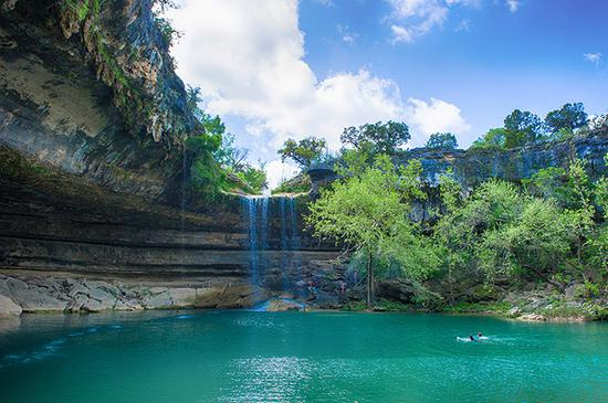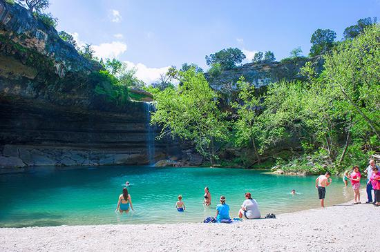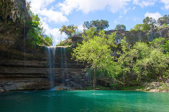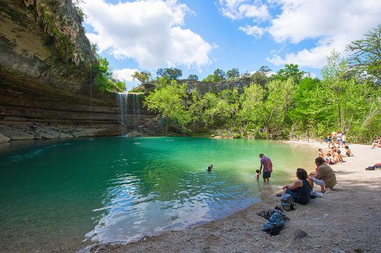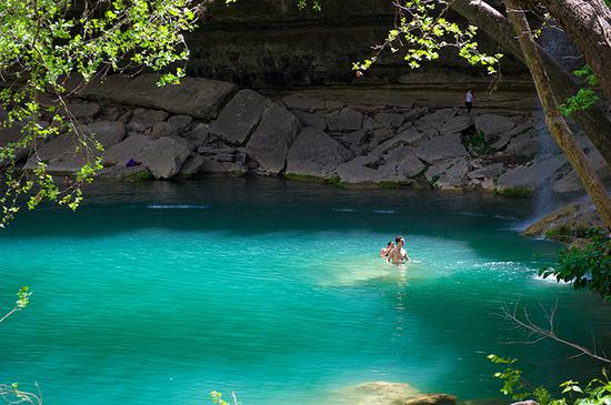 美国德克萨斯州的汉密尔顿池(Hamilton Pool)是世界上最美丽、最奇特的湖泊之一,也是一个天然的、巨大的游泳池。数千年前,地下河的圆顶被侵蚀导致大规模的坍塌,形成了这一人间仙境。翡翠色的湖水清澈透明,不但可以在水中畅游,旁边悬崖峭壁上还有一个高达15米的雄伟瀑布做衬,一派水月洞天的景象。大自然的鬼斧神工创造了这一神奇的景象,夏季来到这个世界上最美的天然泳池游泳泡澡,绝对是一次浪漫之旅,观赏之余还能顺道消暑。