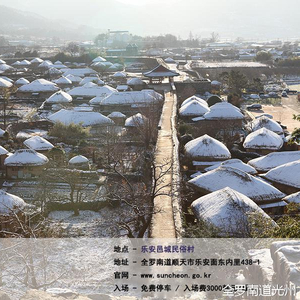 乐安邑城民俗村内的屋顶盖上了厚厚的一层白雪,仿佛稍稍一碰就有雪花落下。如果想看更壮观的雪景,推荐去后面的城墙上,可以向下俯瞰整片民俗村的雪景,就如同童话故事里一般,纯净又美好。