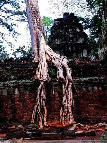 繁华过后,塔布隆寺没入了漫漫的热带丛林。从此,高棉的微笑消失于无形,植物的盛世开始到来,树木野草拼命地汲取残存的生气,仿佛是借体重生,它们疯狂地将柔软的身体植入城池建筑,筋须伸进石缝,树根爬上墙头。于是,原本华美的建筑在温柔缓慢的进攻中崩裂扭曲,原本坚硬的线条慢慢收缩成千回百转,低到了尘埃里,连叹息都要看人脸色一忍再忍。