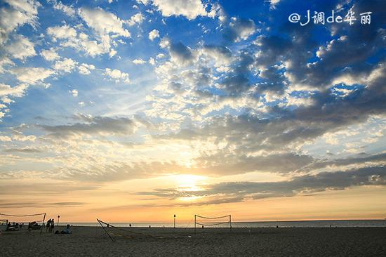 夕阳在渐渐收敛起最后的光芒,天空的颜色瞬息万变,沙滩上的人们沉浸美丽的暮色里久久不肯离去。