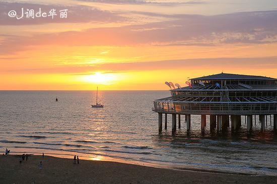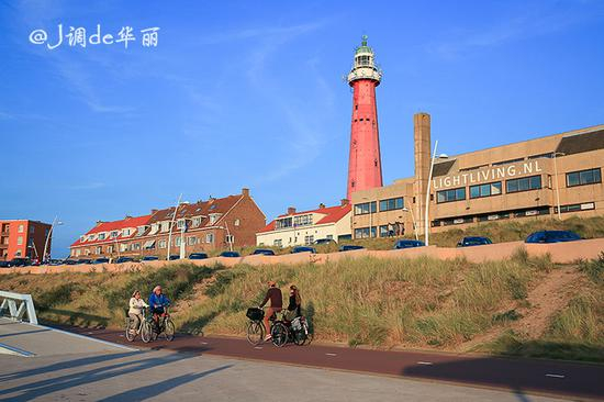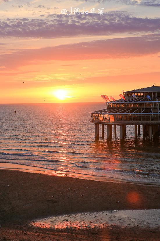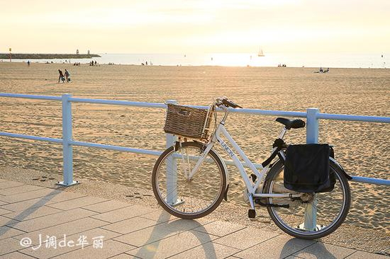 海滩的另一头也渲染上了橘红色,夕阳拉长的影子在地上斑驳。自行车道上有人慢悠悠地骑着车,也许在荷兰骑自行车也是傍晚“散步”的一种方式。