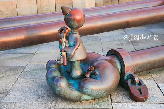 这些青铜卡通雕像来自美国雕塑家Tom Otterness的“海边民间故事卡通雕塑”系列作品,形象地描绘了人与大海的民间故事。