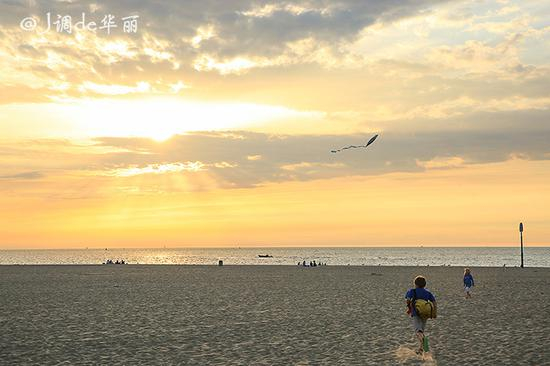 小孩子们在广阔的沙滩撒丫子尽情地上奔跑追逐嬉闹,手里的风筝乘着海风在日落云天里起舞。