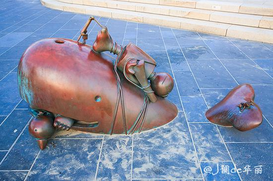 雕塑家就地取材,以地面作为海洋将巨鲸雕塑完美地嵌入其中,非常有画面感,让人仿佛身临其境。