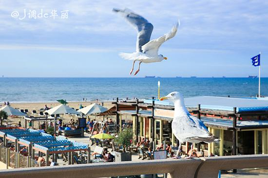 席凡宁根海滩的一切都是那么随性和放松,海水和天空在眼前涂抹出一片纯净的蓝色,还有海鸥不时在身边停靠,与人一起欣赏海景。