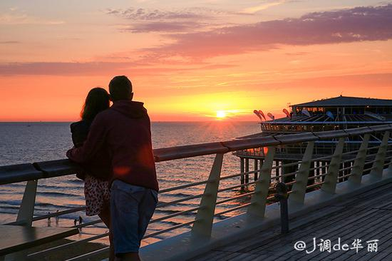 一对恋人紧紧相拥着一起看日落,他们甜蜜的背影和夕阳融为一景,此时此刻的浪漫不言而喻。