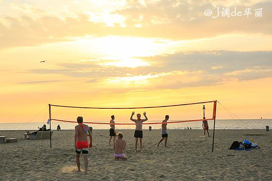 有人沐浴着日落的金光在海滩上进行着各种各样的沙滩活动,也有人慵懒地躺在沙发椅上悠闲地看日落。