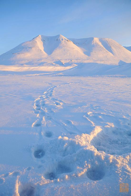 向导带着我们骑行在峡湾冰冻的海面上,当他看到白色大海上星星点点的黑色斑点时,就断定,这里一定有熊出没,因为那些黑点是环斑海豹——北极熊最钟爱的食物。最终,我们没遇到北极熊,但真的看到了熊迹,巨大的足印和身体印记…我们也还是挺兴奋的。