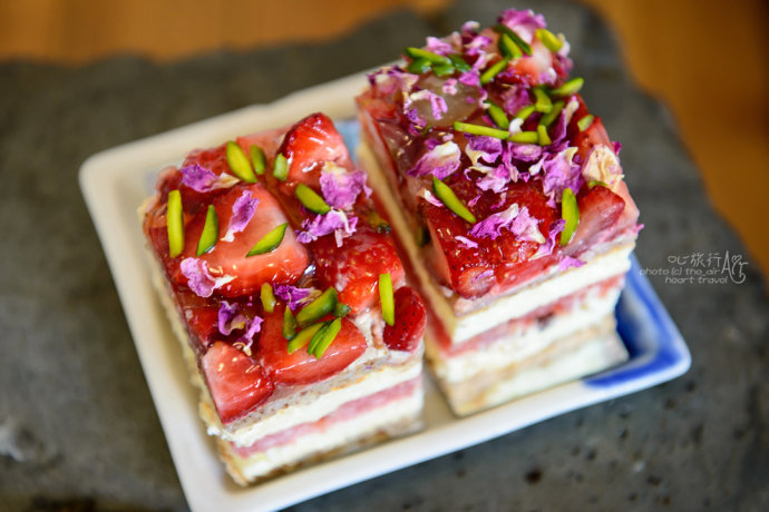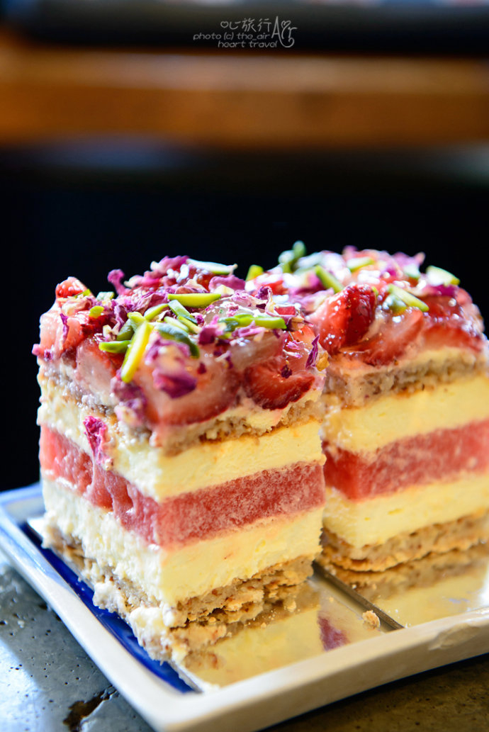 这就是网红的草莓西瓜蛋糕了,一块蛋糕分了六层,中间一层红色的是西瓜肉,最上面是满满的鲜草莓和玫瑰花。吃蛋糕的时候一定要一勺到底,全部放进嘴里,然后尽情享受多层次的味道和口感带来的愉悦。整款蛋糕甜度不高,饱含汁水的西瓜带来新鲜水果的清新,感觉确实很奇妙。