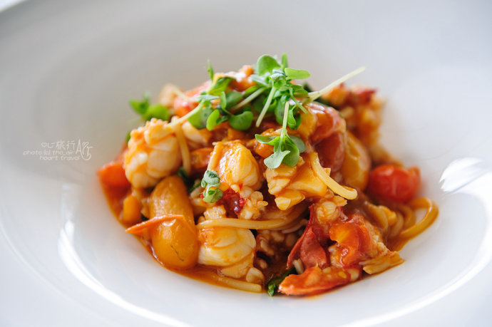 鲜美弹牙的大块龙虾肉一口咬下去有汁水在口中爆出,番茄不会掩盖龙虾的鲜美,反而让这种鲜美更加浓厚。爽滑的意大利面包裹着浓郁的汤汁,让人欲罢不能。