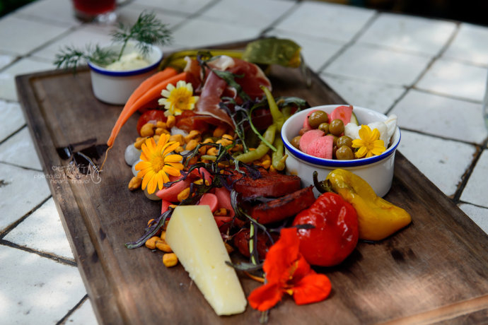 餐厅的颜值高,菜品的颜值更高。前菜拼盘,薄如蝉翼的西班牙火腿,搭配腌橄榄、腌辣椒,配以娇艳的花朵,还未入口,已经是满心的好感。
