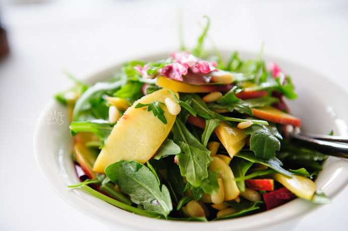 前菜要了一个沙拉,微苦的芝麻菜,居然搭配的是桃子,再间或咬到一两个松仁,简直美妙极了。这样出其不意的搭配,带来惊艳的效果。
