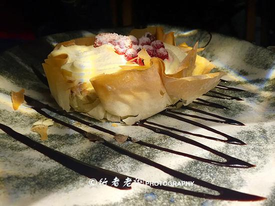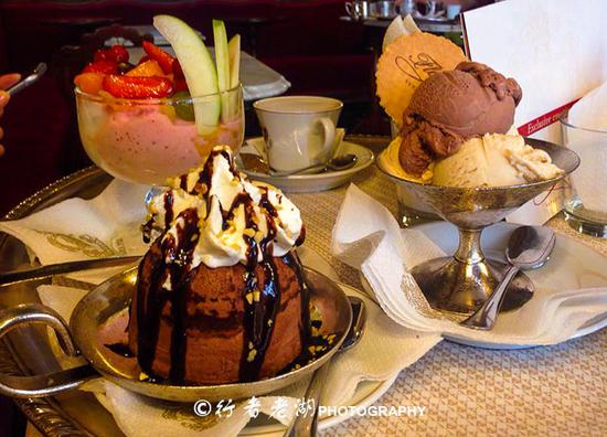 在三百年咖啡厅喝咖啡,吃茶点,自然是一口值千金。一杯卡布奇诺9.5欧元,约70人民币;冰淇淋蛋糕17.5欧元,约135人民币;更贵的是每位客人还要为门口演奏的乐队付6欧元的音乐费。