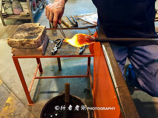 这位工匠在向我们演示如何用烫融化的玻璃拉一支玻璃马,烧得火红的玻璃看得人心惊,又担心它太快冷却,需要匠人冷静迅速地成型。许多工坊的前面就是商店,售卖这里手工制作的彩色玻璃制品。千万不要在第一家就看花了眼着急买,一定要多看几家,比比工艺和价格再买。
