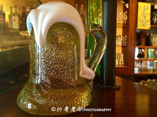 与工坊的少东家相聊甚欢,他介绍我们来到这家在当地口碑很好的餐馆,午餐时间,的确当地人很多,我们还等了将近半小时才有座位。等座位的半小时并不无聊,因为我们对吧台上的和餐厅里的各色玻璃制品都好奇不已,大拍特拍,这杯逼真的啤酒整个都是用玻璃做的。