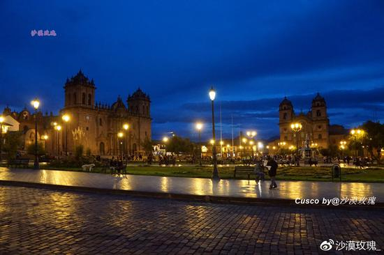 走到老城区的武器广场,此时夕阳西下,一片安静祥和。库斯科大教堂巍然耸立,广场中央的塑像正是末代帝王图帕克·阿马鲁。