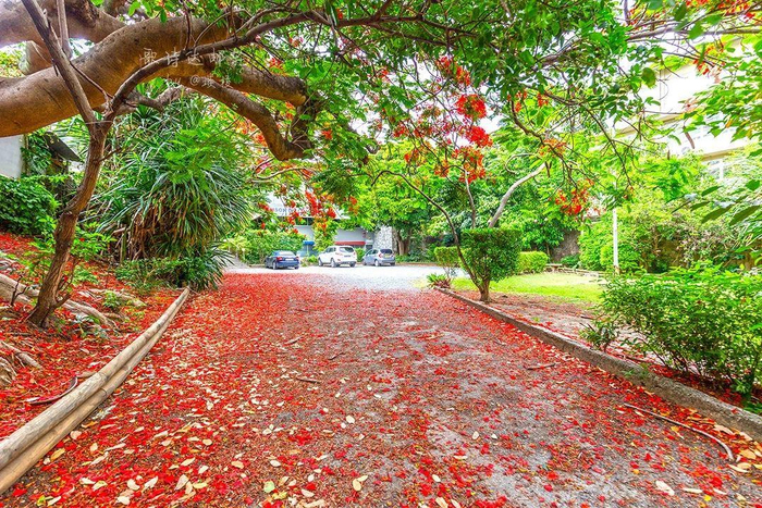 红色的花开得绚烂,坠落的花瓣铺满了地面。火红一片,地面仿佛在燃烧一般。
